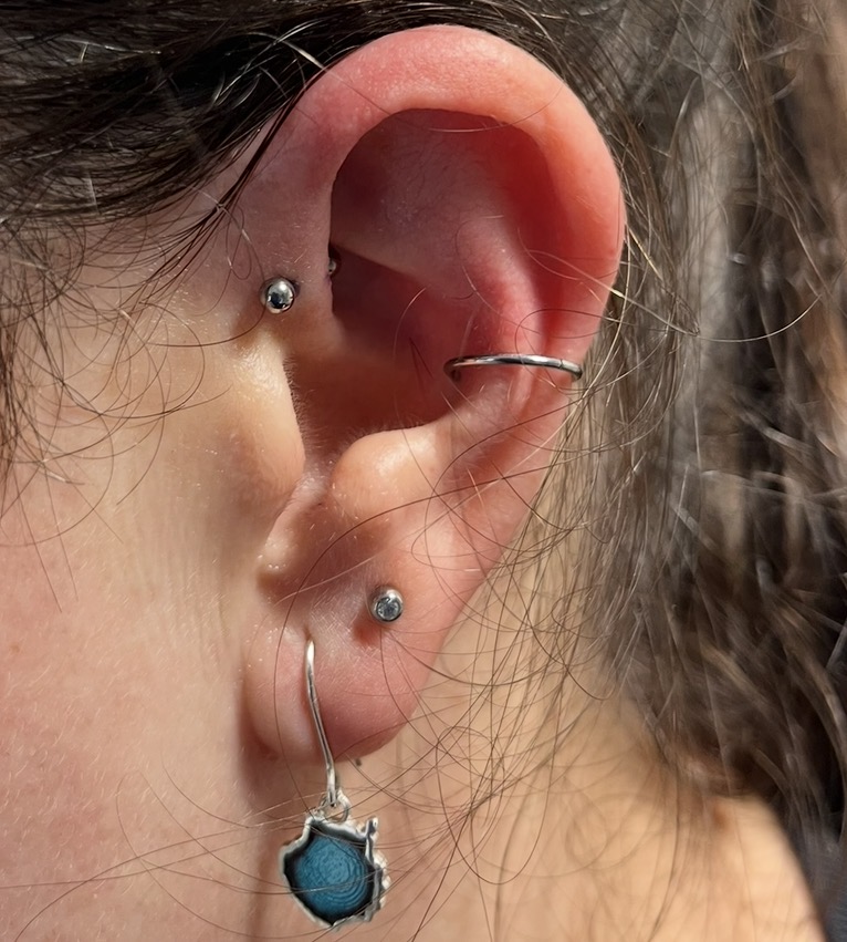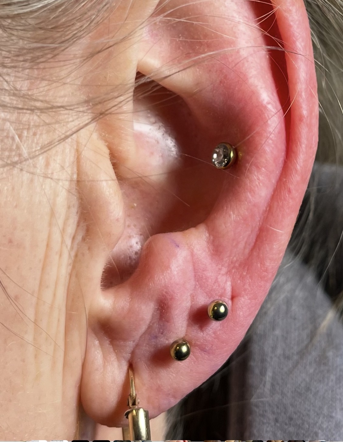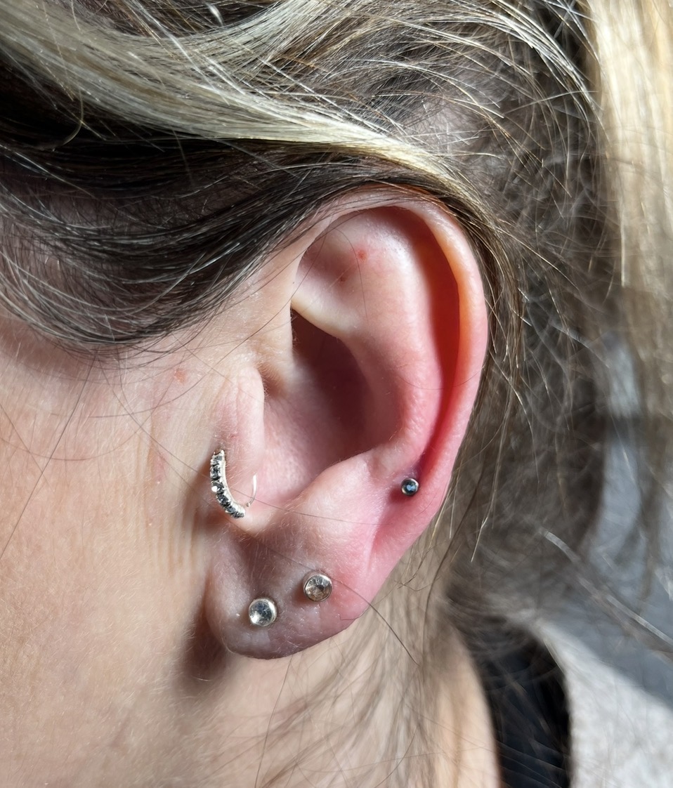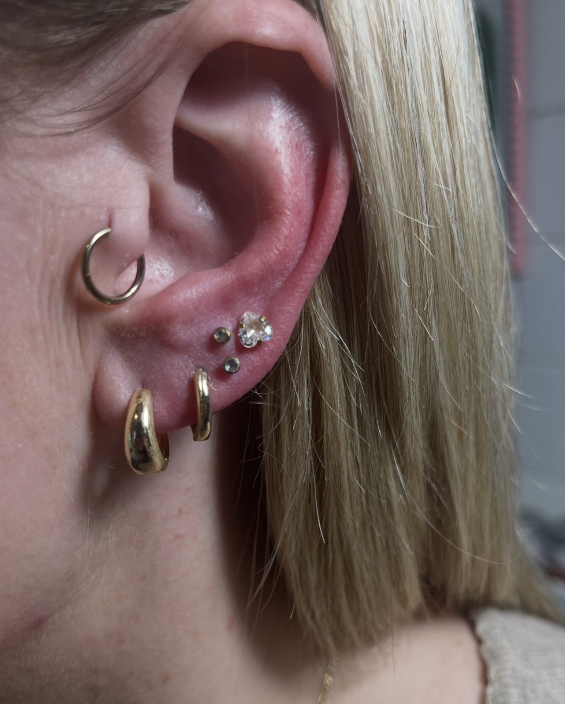 I use implant-grade titanium jewellery and carefully selected attachments so each piercing is both safe and beautifully styled. My approach focuses on personalised ear curation, helping clients create something unique to them.