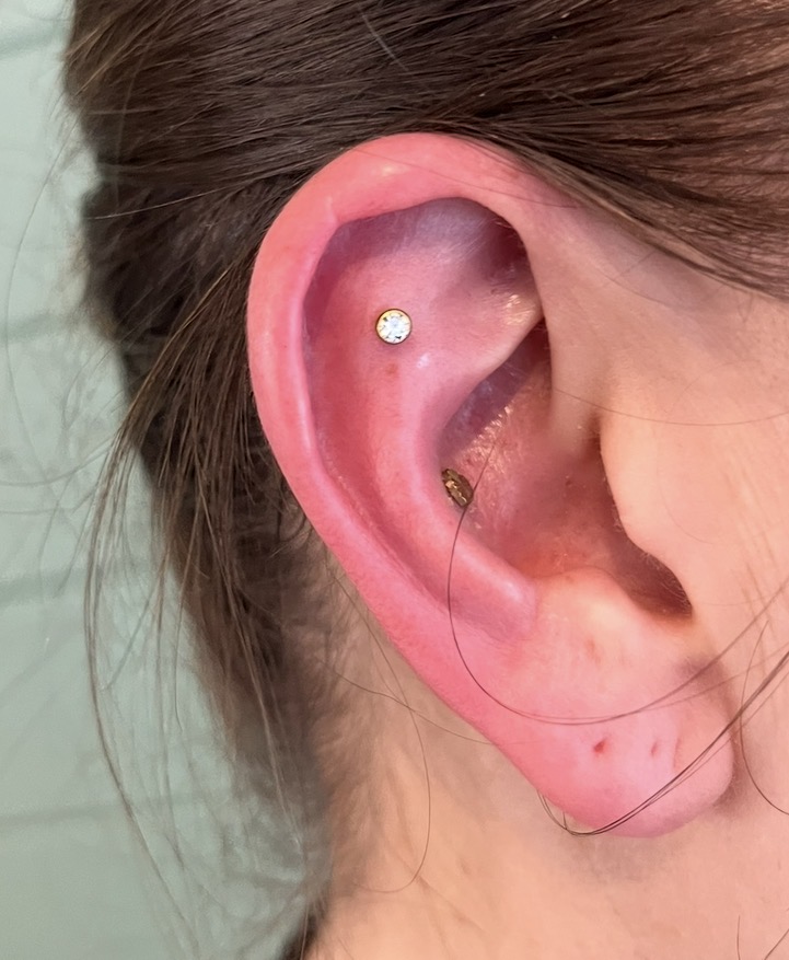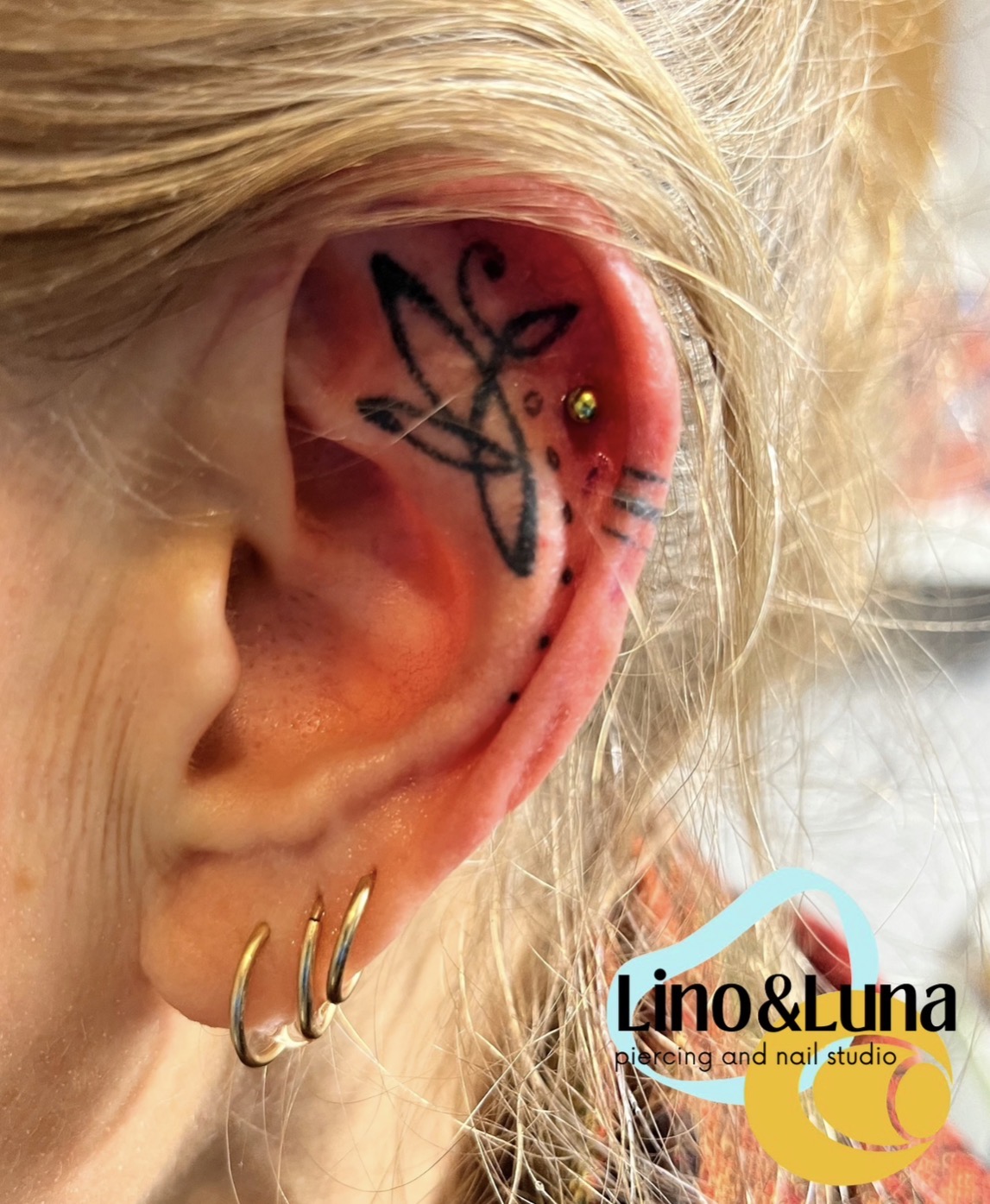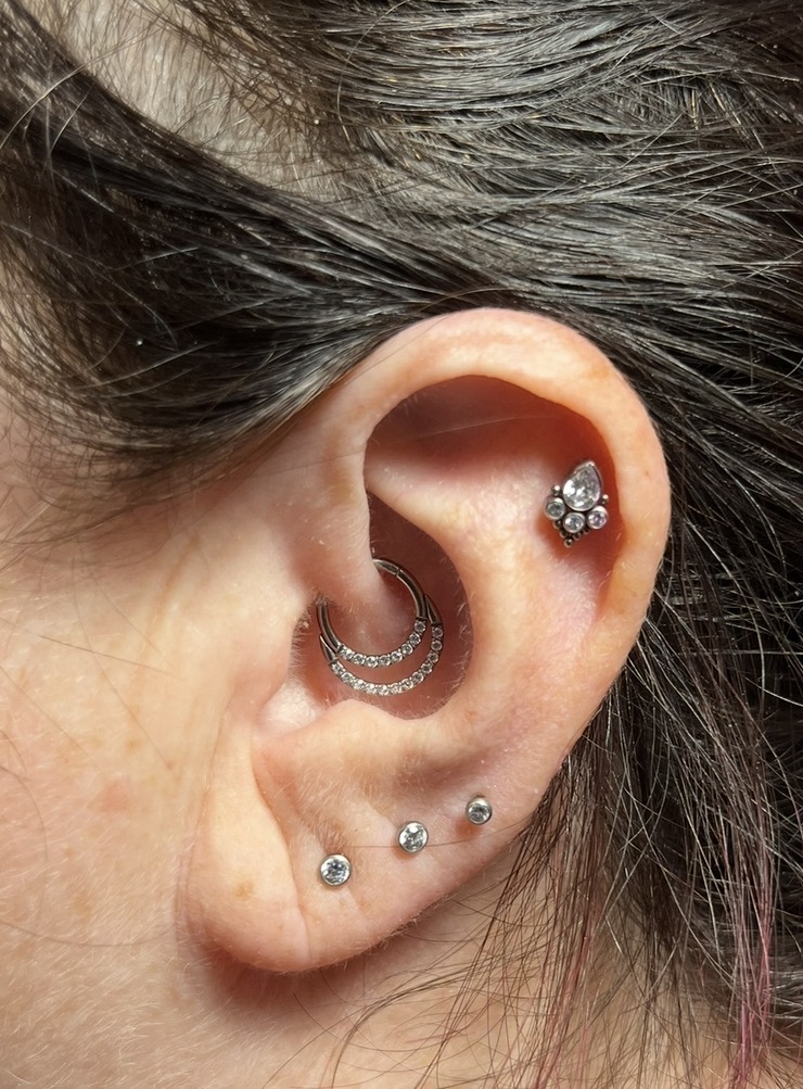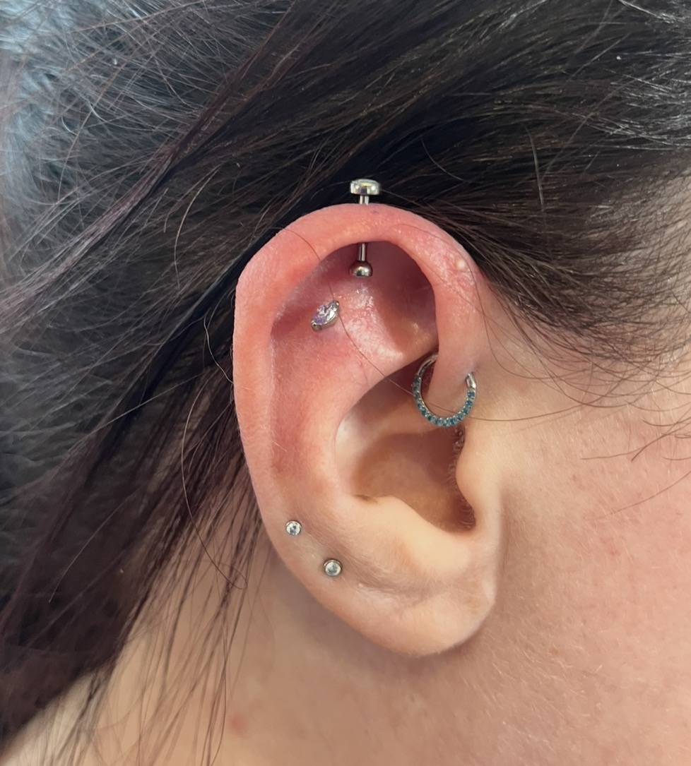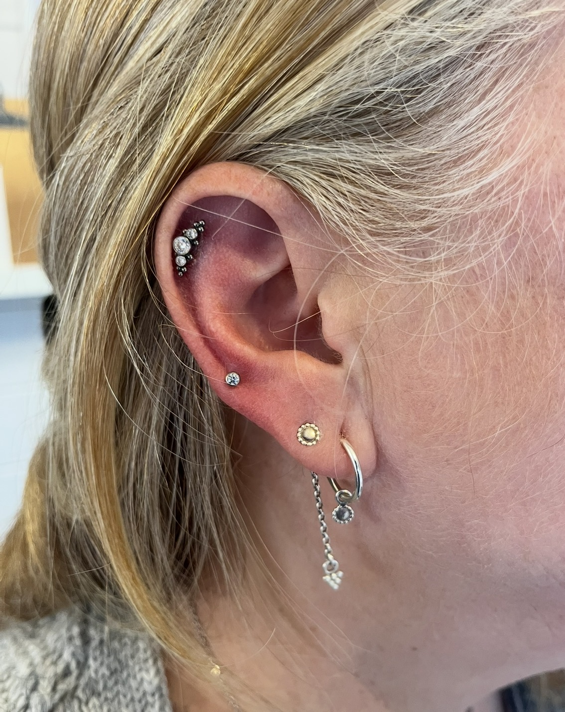 I use implant-grade titanium jewellery and carefully selected attachments so each piercing is both safe and beautifully styled. My approach focuses on personalised ear curation, helping clients create something unique to them.